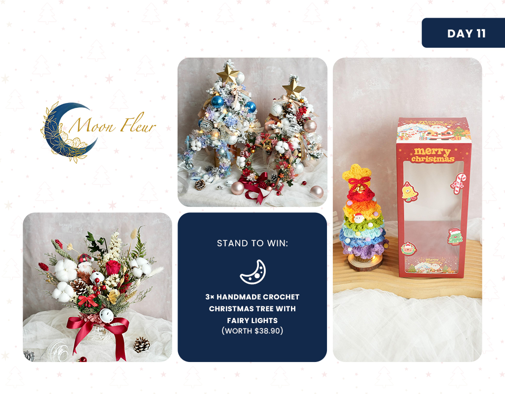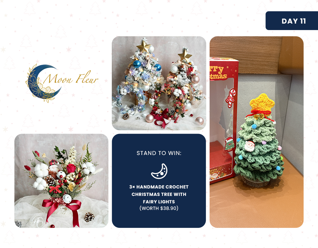Celebrate the holidays with Moon Fleur’s enduring floral charm. Whether it’s a handcrafted bouquet or personalised floral art, each piece is thoughtfully made to stay just as beautiful as the memories it captures. ๐ฟ We will be giving away 3 x Handmade Crochet Christmas Tree with Fairy Lights (worth $38.90).