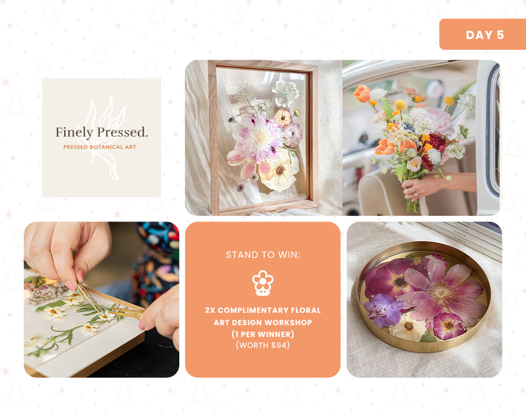 Lovingly preserving meaningful flowers through the art of pressing, Finely Pressed transform your cherished blooms into heartfelt gifts for your loved ones. Each piece is thoughtfully handcrafted to capture the beauty, emotion, and memories behind every petal. ๐ธ๐ท๐ฟ This Christmas, we will be giving away 2 x Complimentary Floral Art Design Workshop (worth $94).
