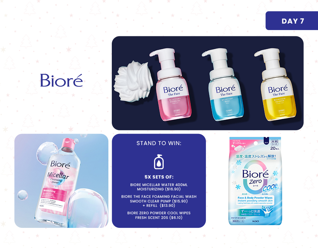 Biore makes everyday cleansing feel effortless — and your skin clearer with each use. Collaborating with Biore, we will be giving away 5 x set of a Biore Micellar Water 400ml Moisturizing ($16.90) + Biore The Face Foaming Facial Wash Smooth Clear Pump ($15.90) + Refill ($13.90) and Biore Zero Powder Cool Wipes Fresh Scent 20s ($6.10).