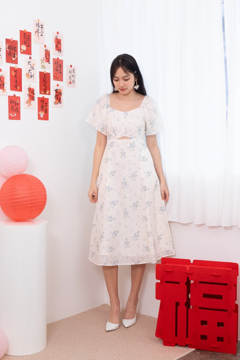 Adelphie Eyelet Flutter Sleeve Cut Out Midi Dress in Blue Florals