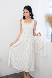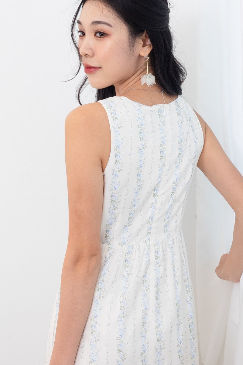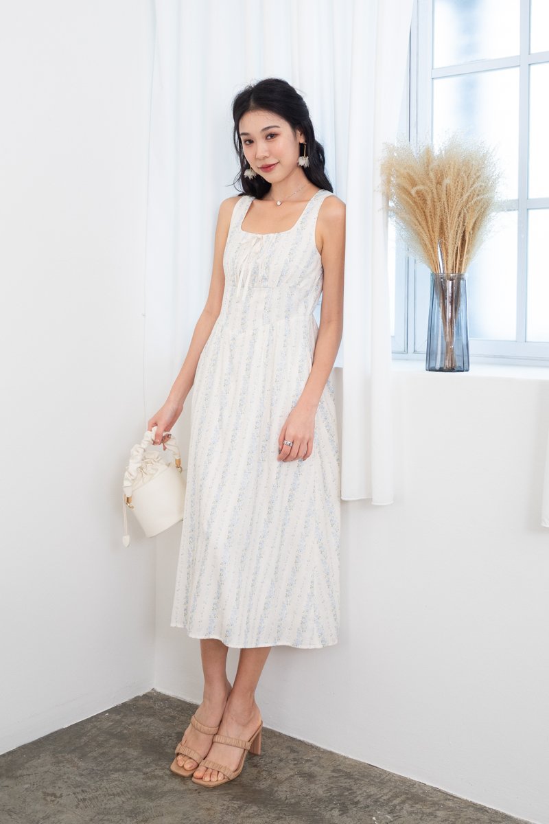 Fiona Tie Lattice Midi Dress in Blue Florals