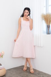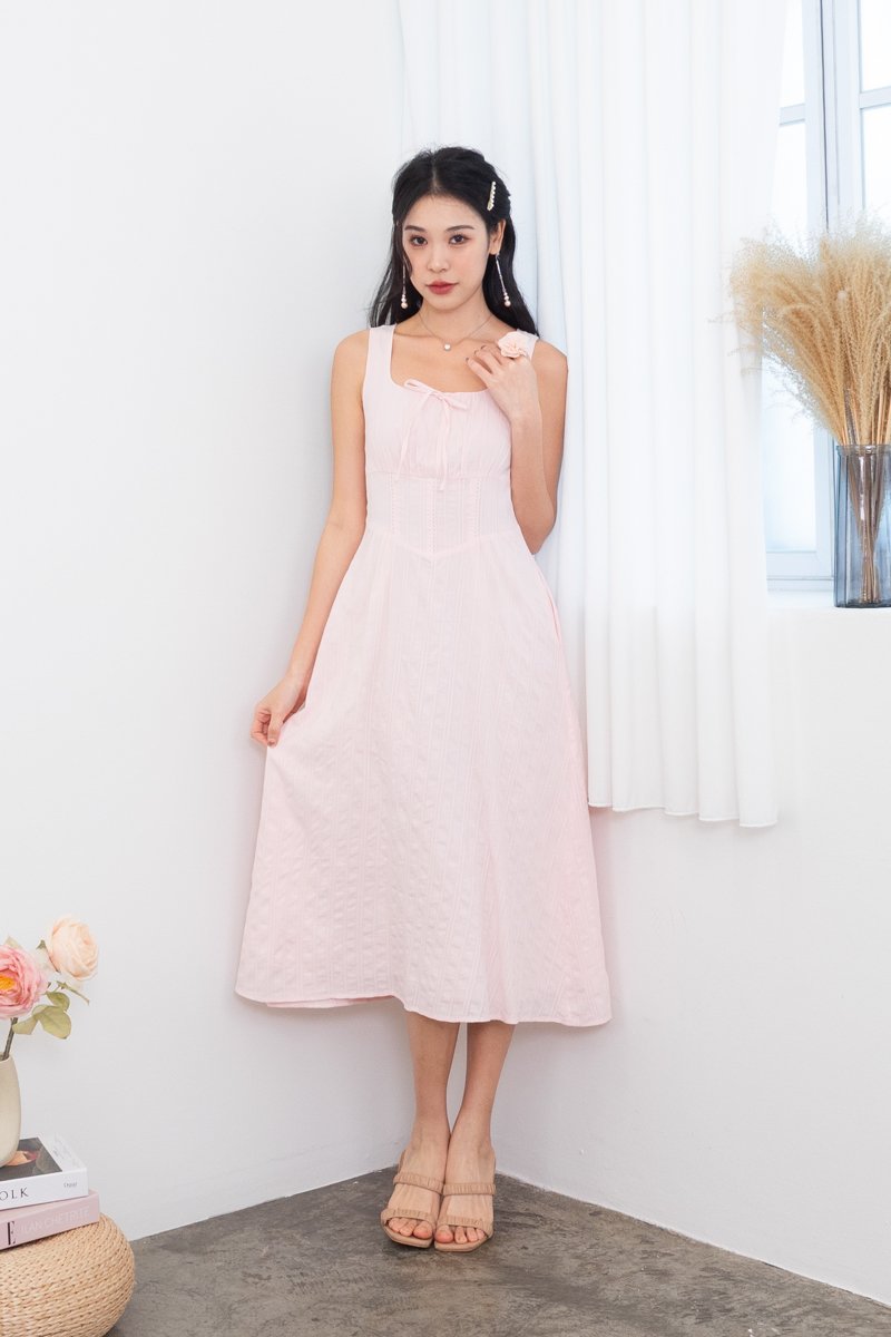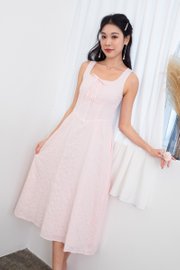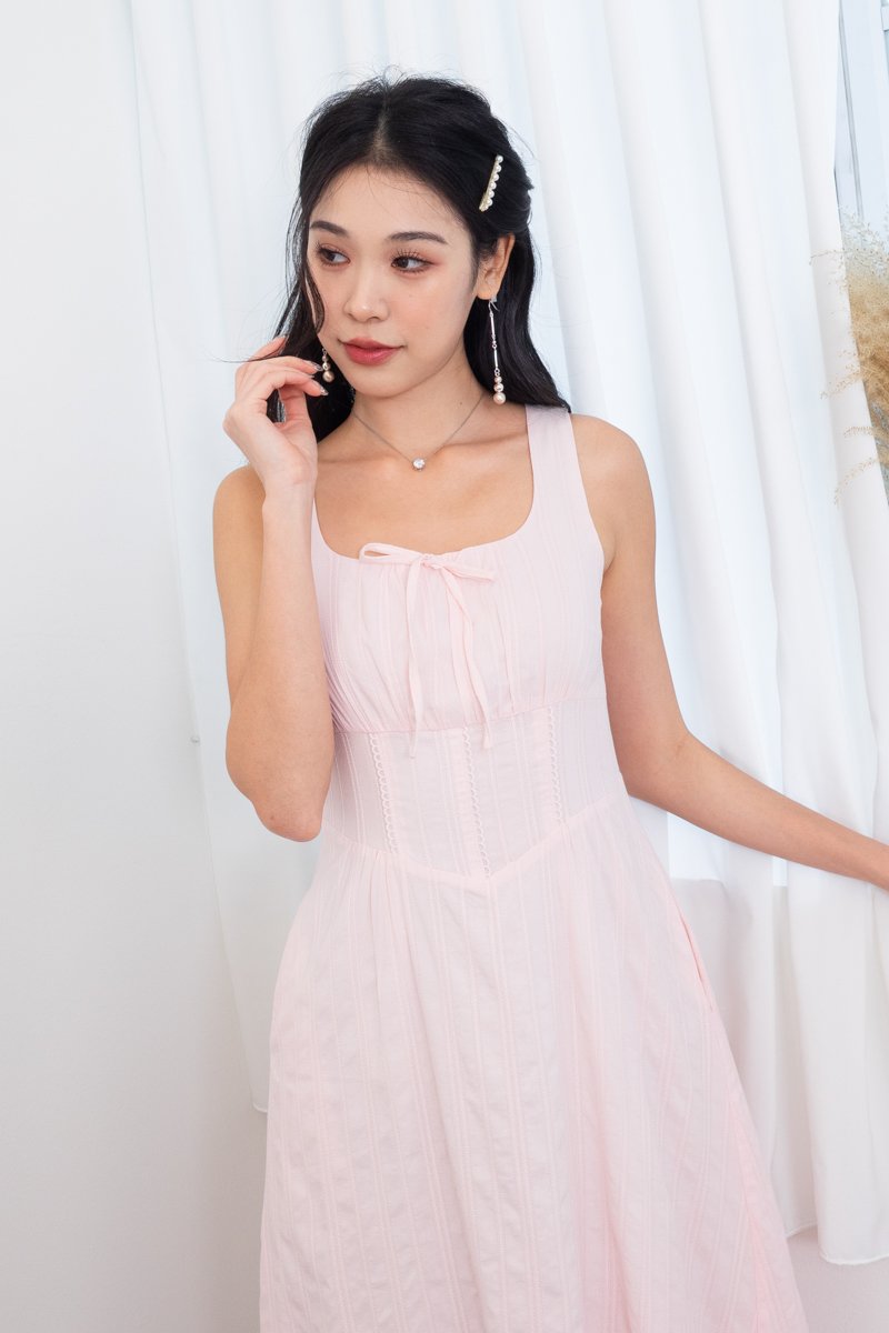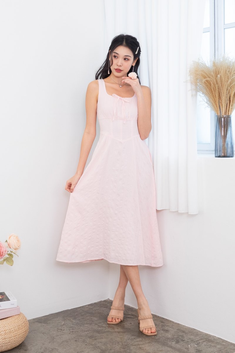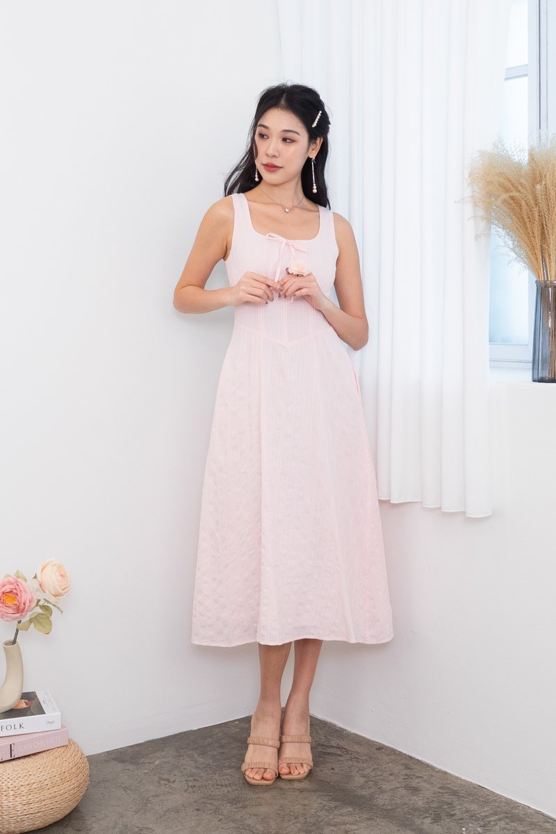 Fiona Tie Lattice Midi Dress in Pink