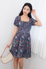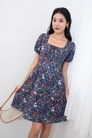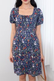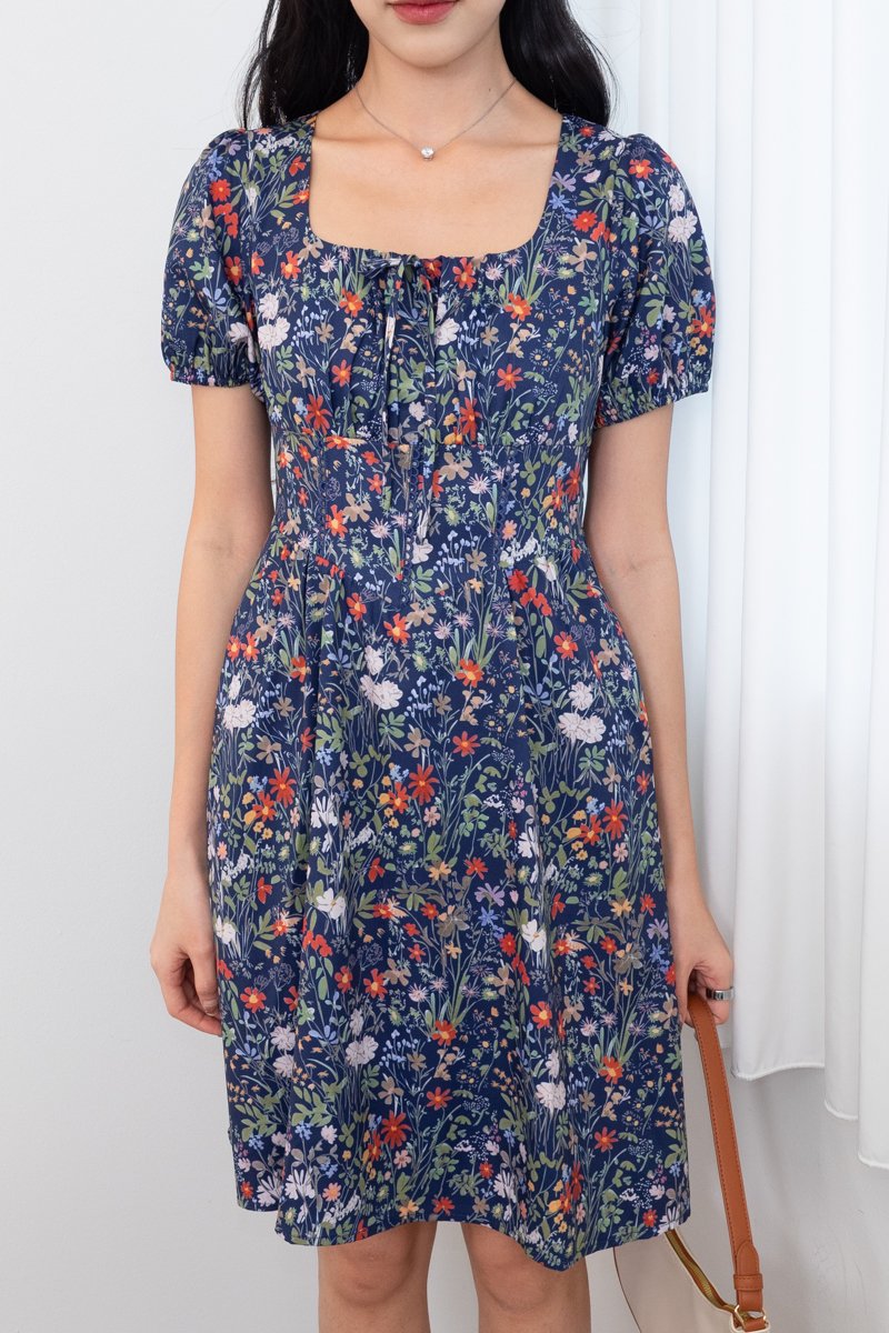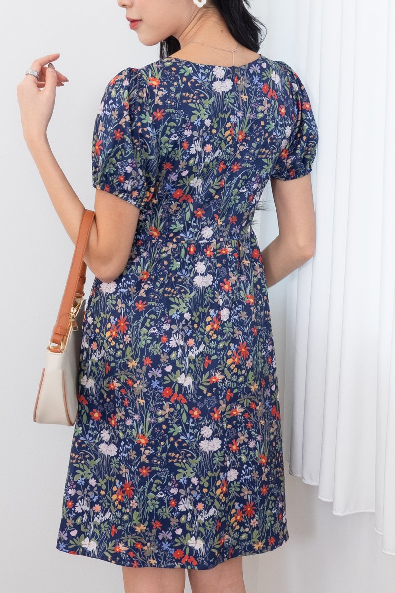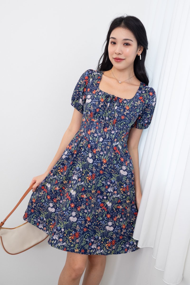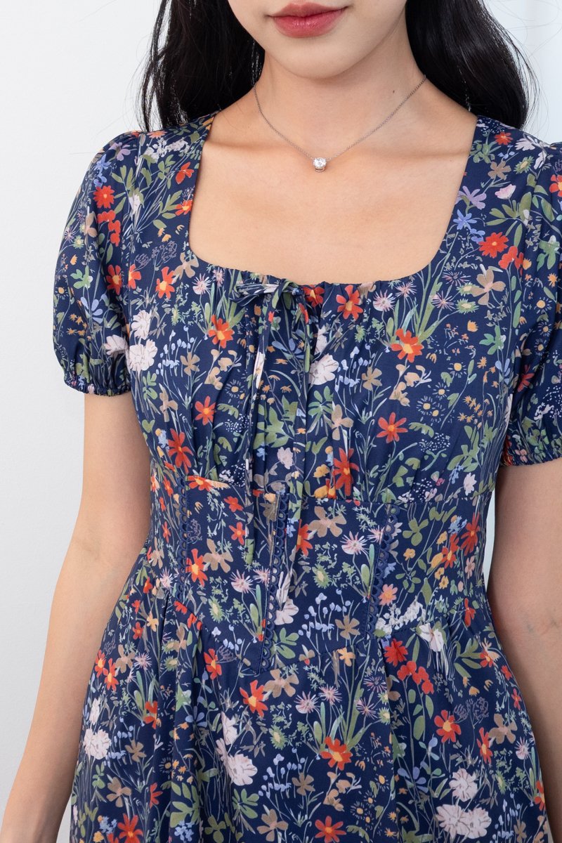 Fonda Puffy Sleeves Tie Lattice Dress in Navy Florals