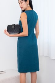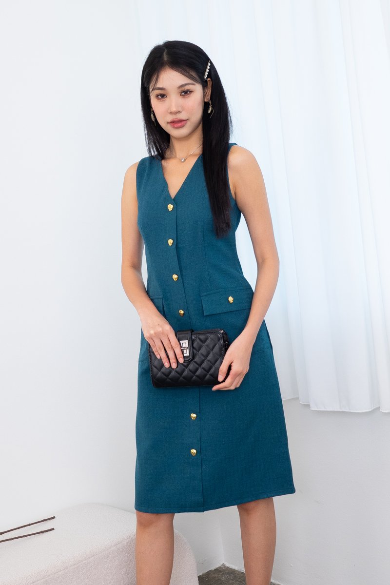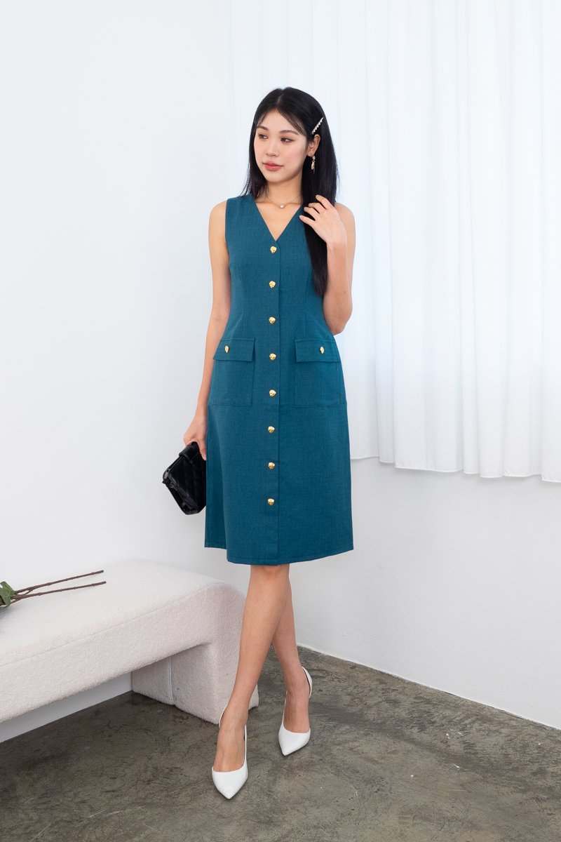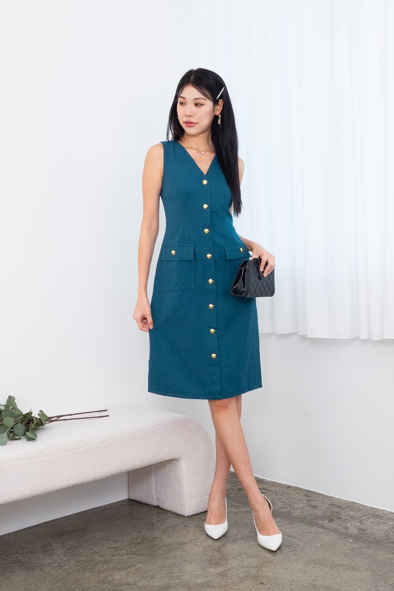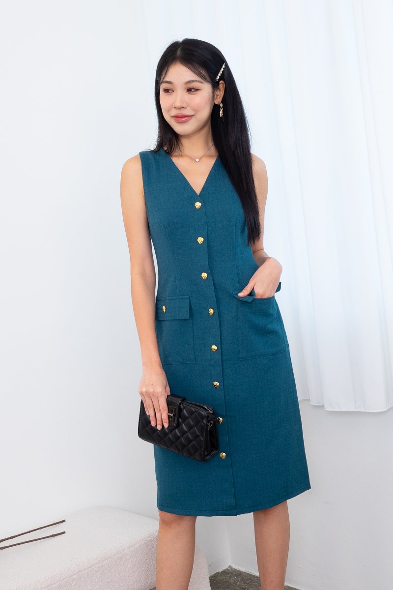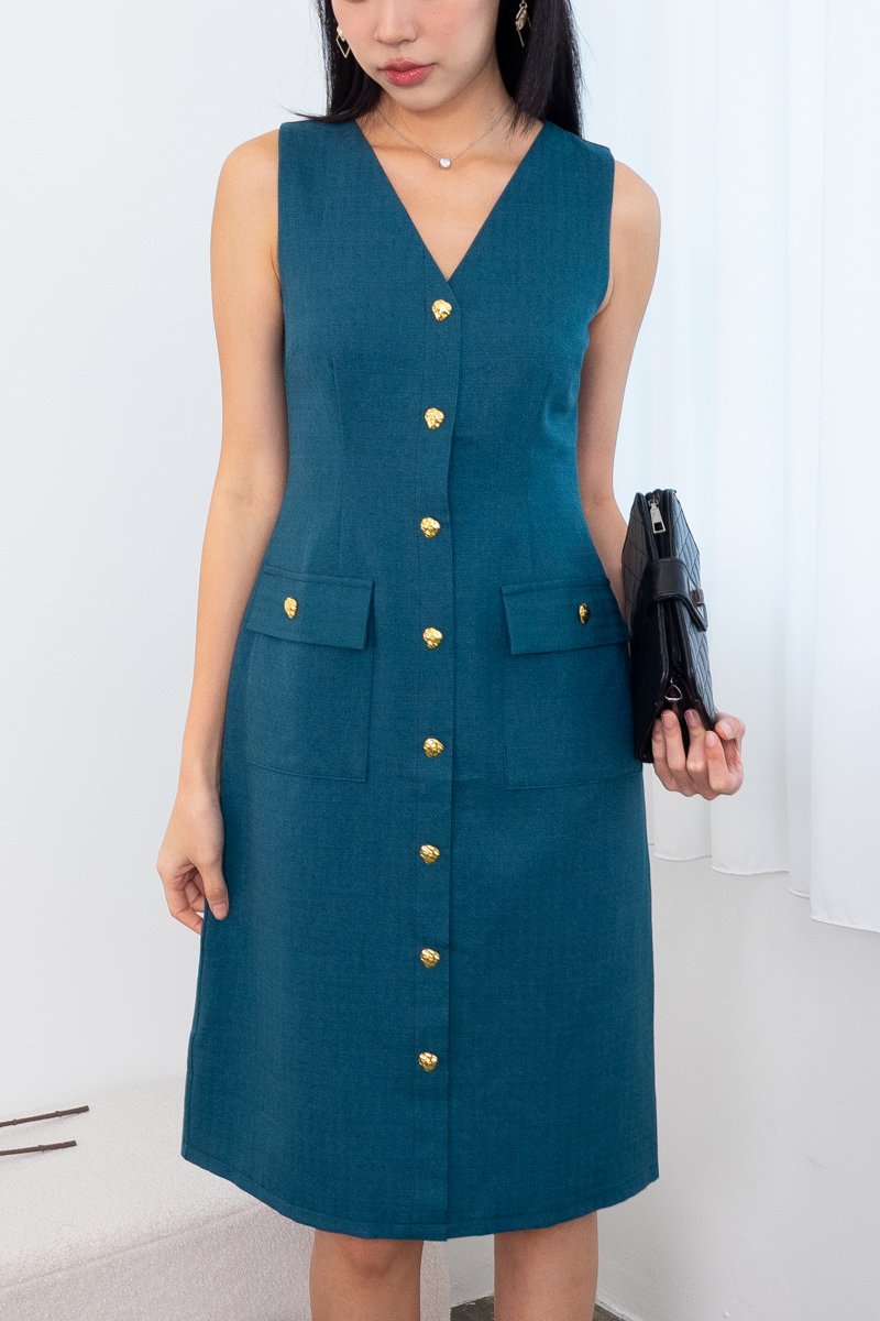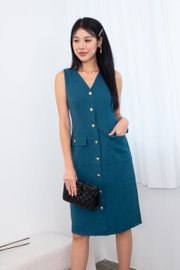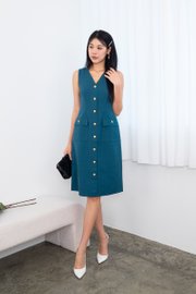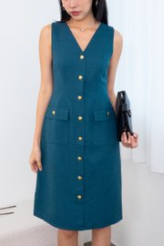 Jaylin Tweed Gold Button Midi Dress in Emerald