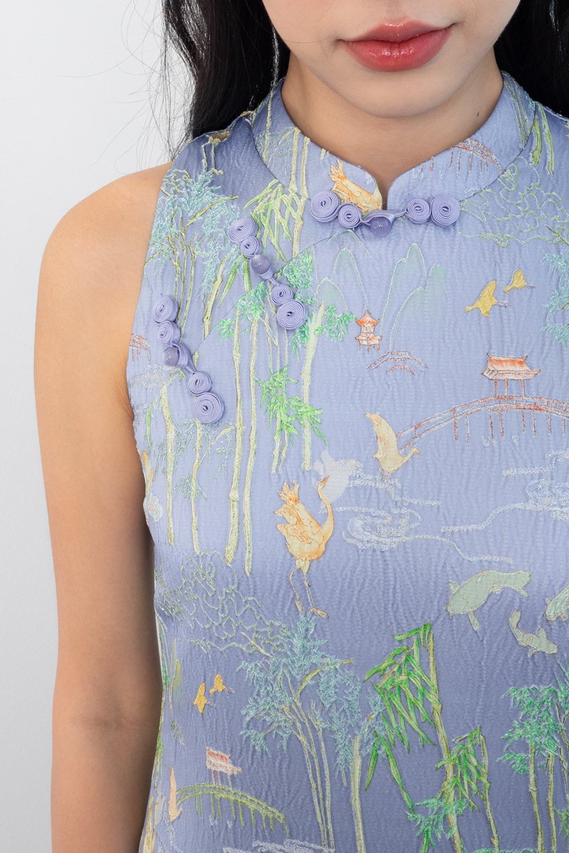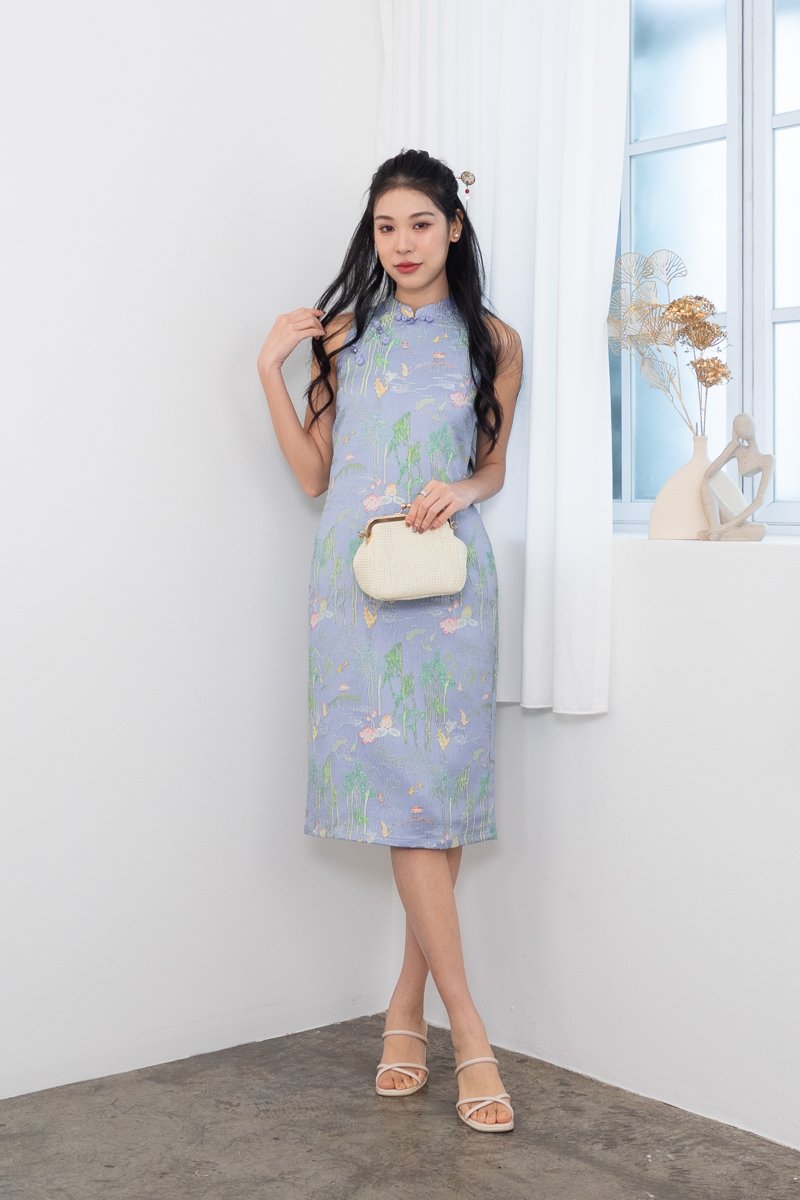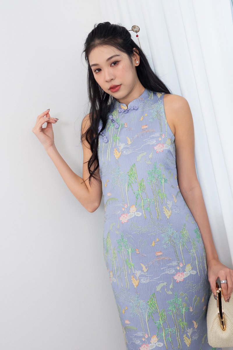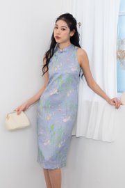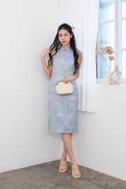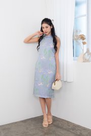 Jin Xi (金禧) Emboss Embroidery Cheongsam Midi Dress in Blue Purple