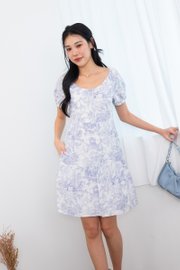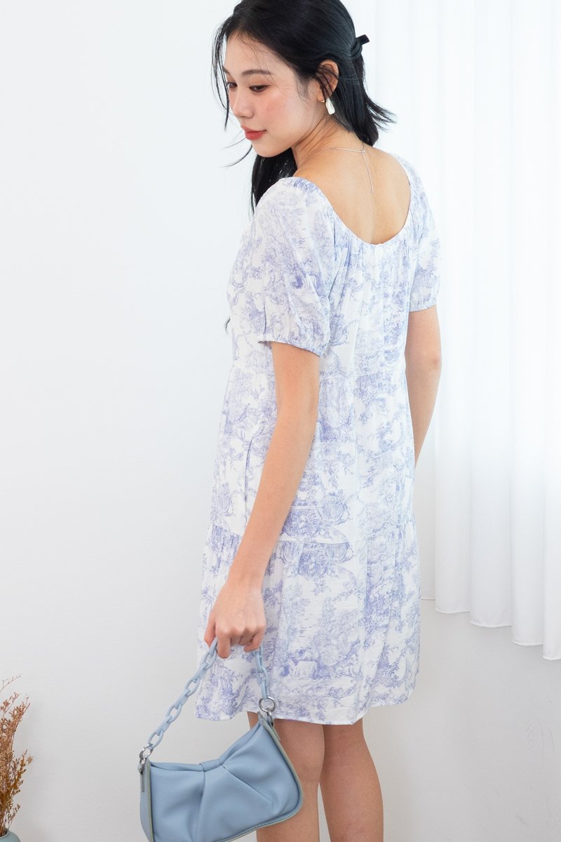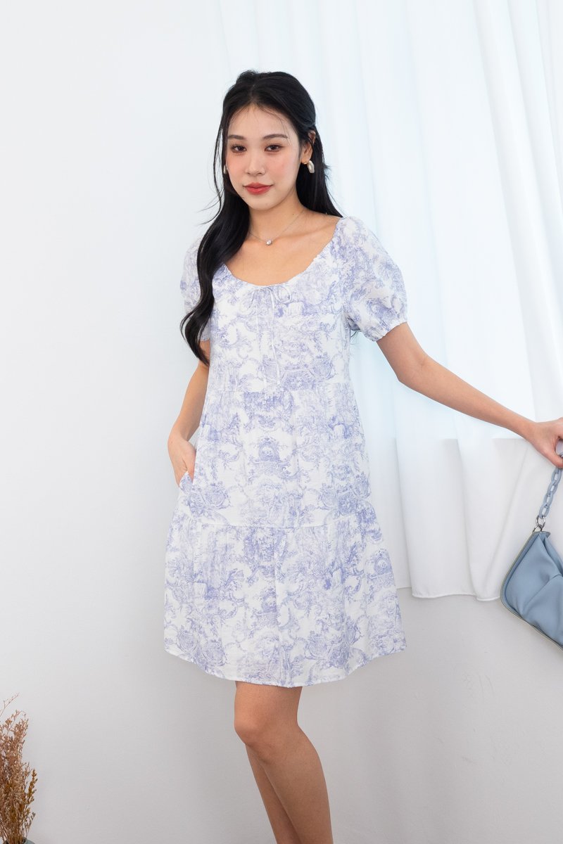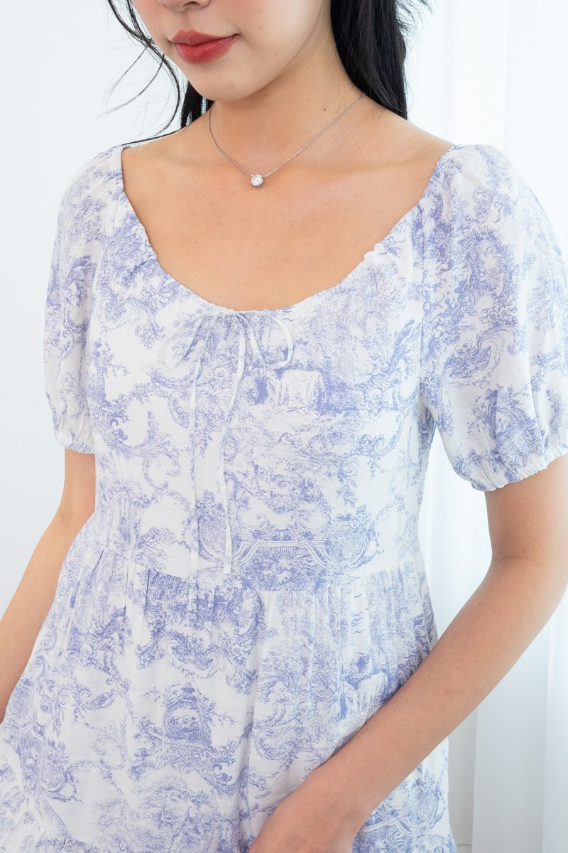 Kamie Porcelain Puffy Sleeves Babydoll Dress in Blue