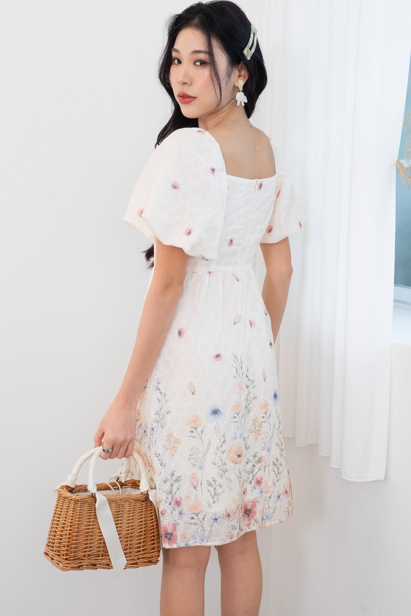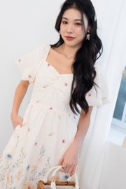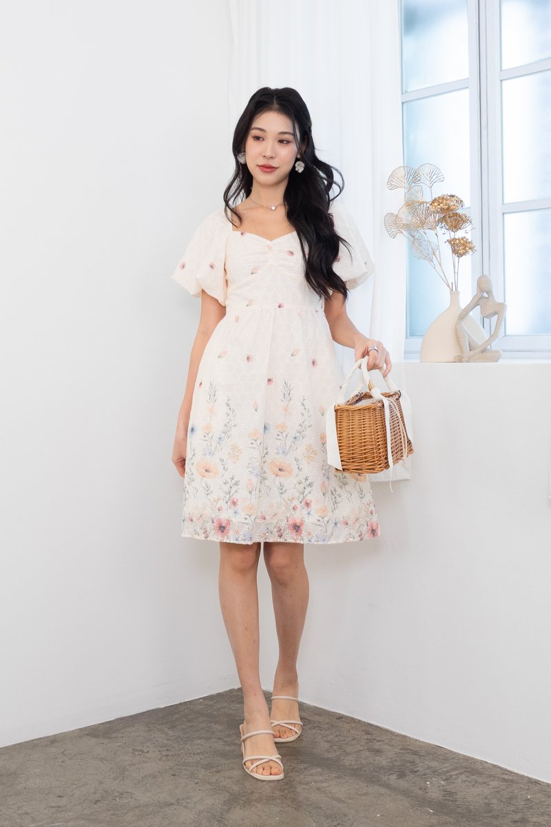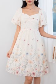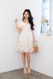 Kyra Print Embroidery Bustier Ruched Babydoll Dress in Buttercream Glow