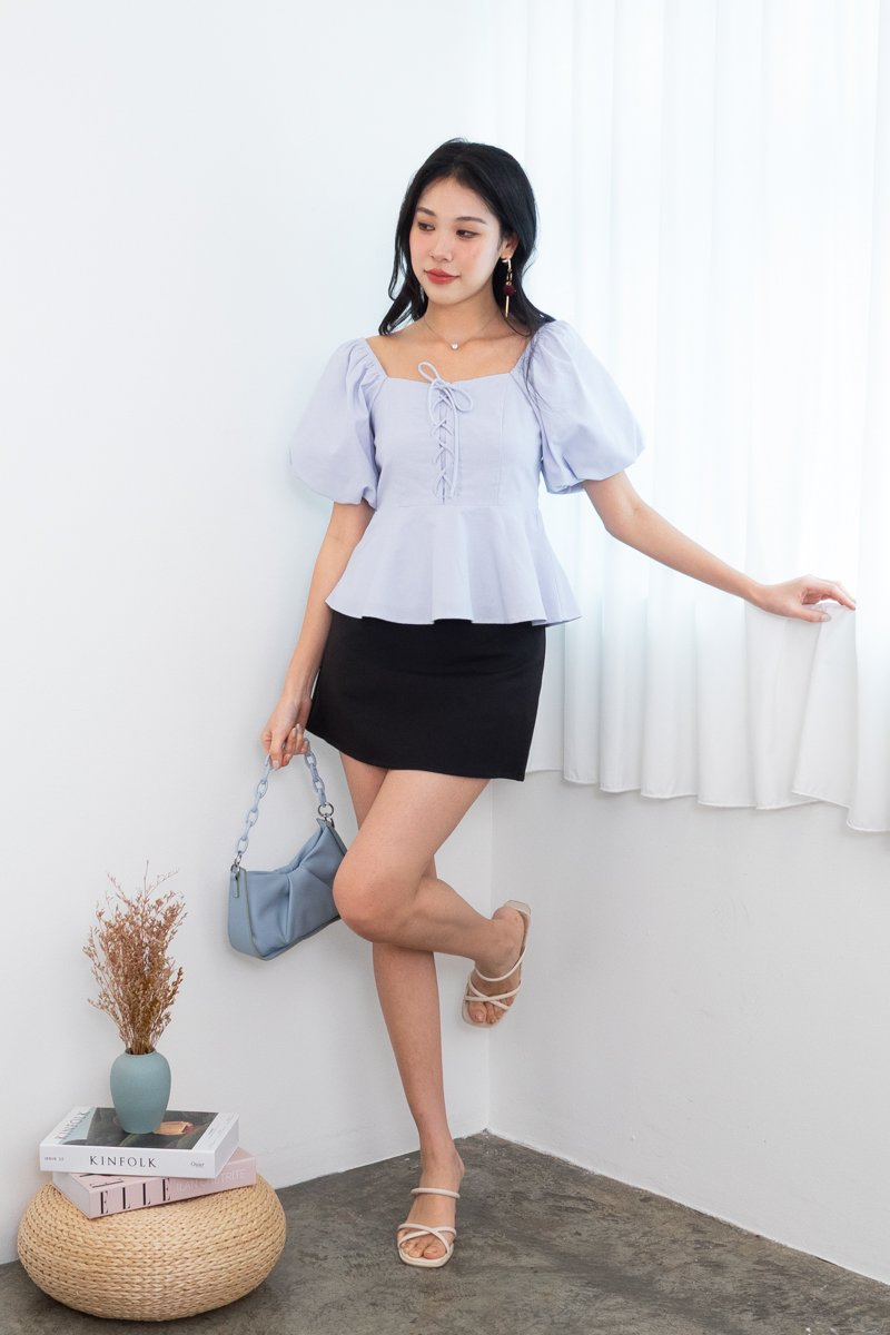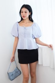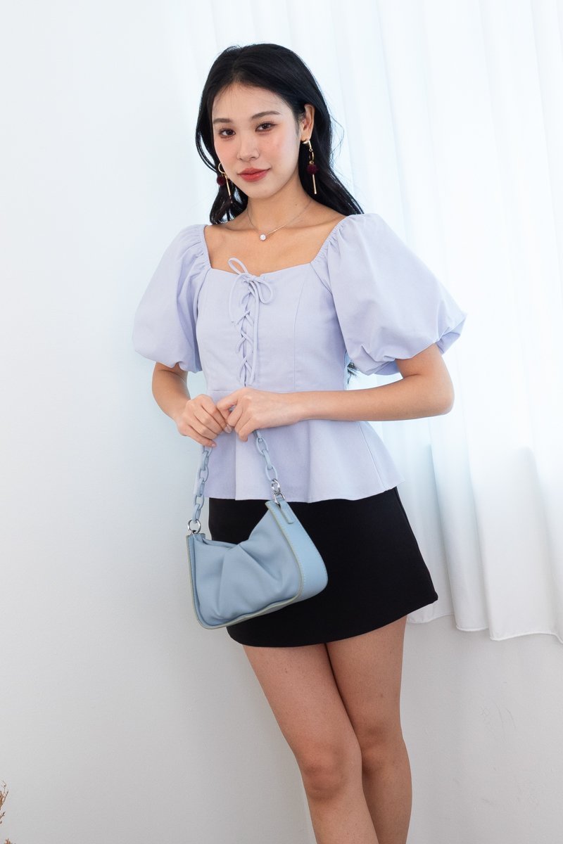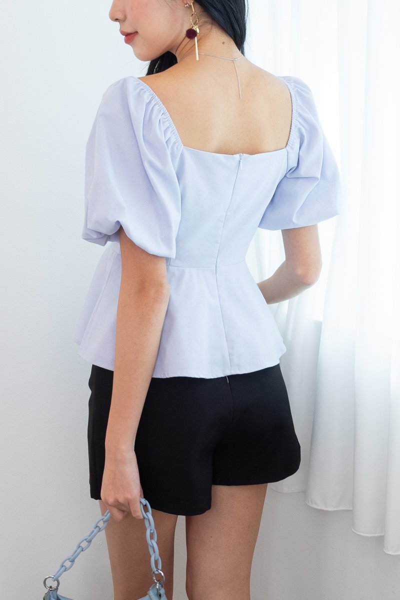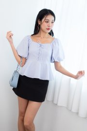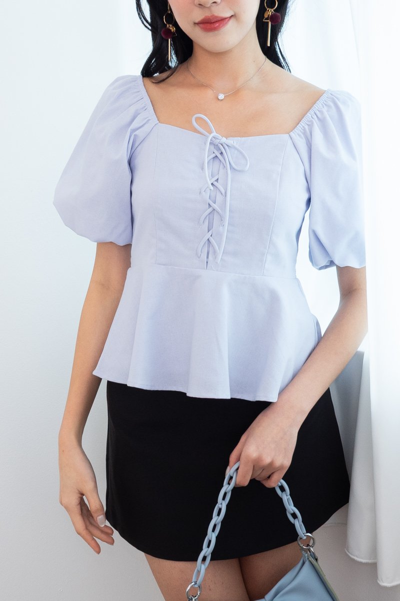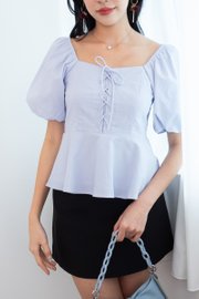 *PREORDER* Gretel Puffy Sleeves Lace Up Peplum Top in Powder Blue