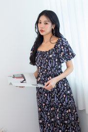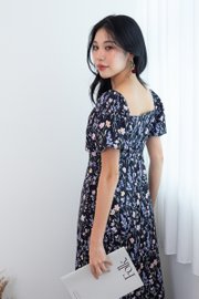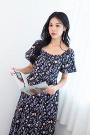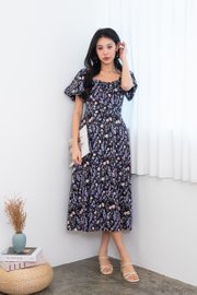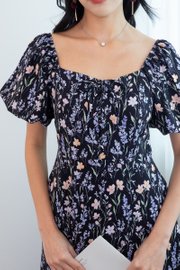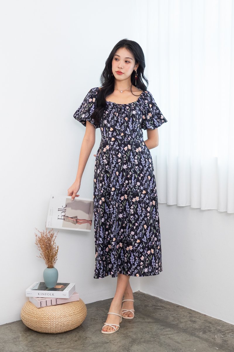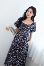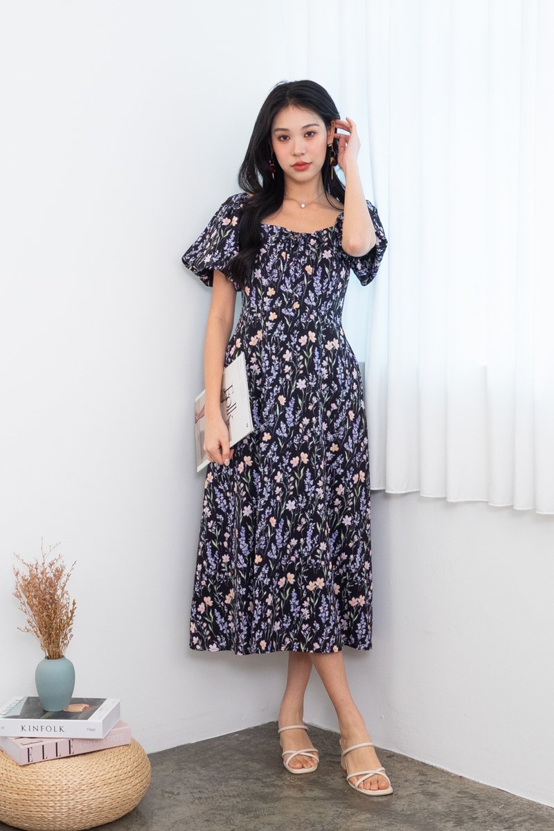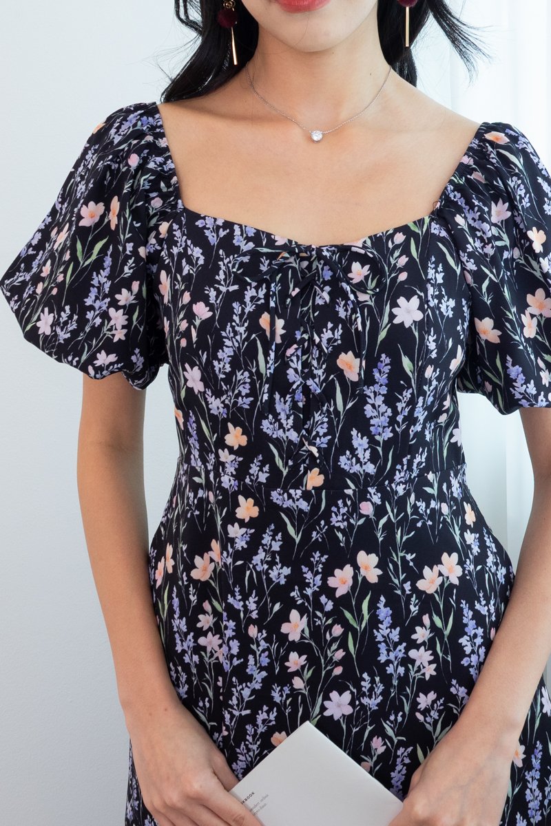 *PREORDER* Malinda Puffy Sleeve Lace Up Midi Dress in Black Florals