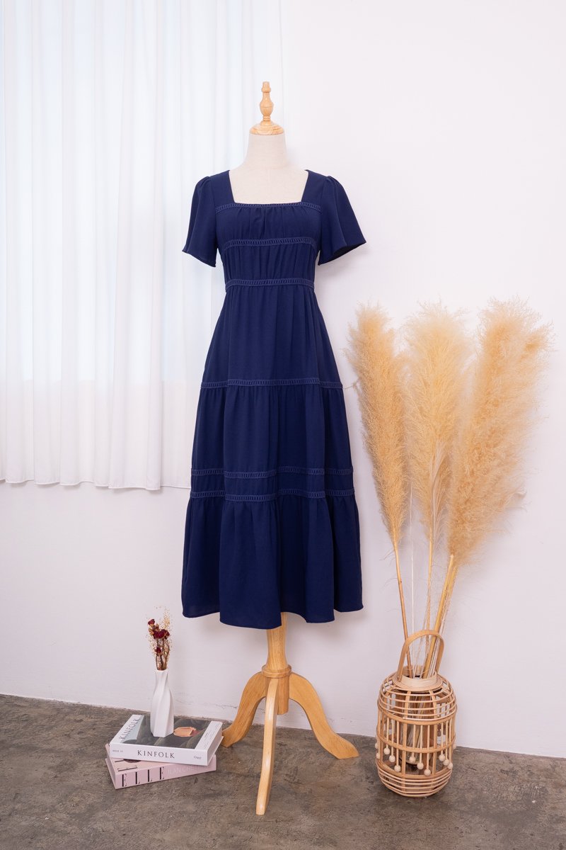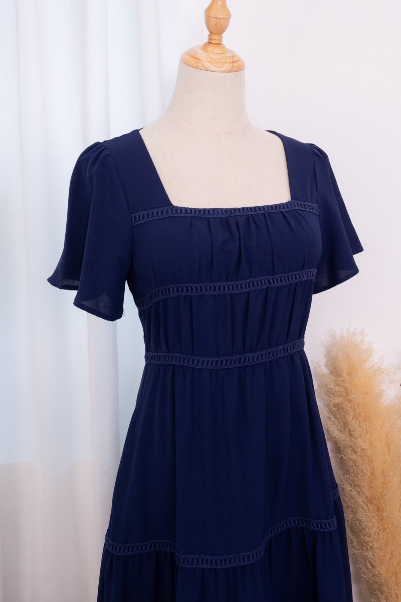 *PREORDER* Raine Flutter Sleeve Lattice Tier Maxi Dress in Navy