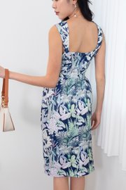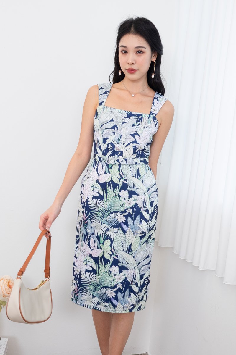 Shillia Thick Straps Midi Bodycon Dress in Tropical Prints