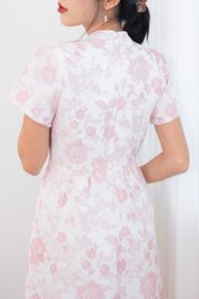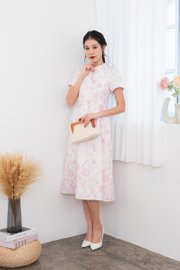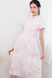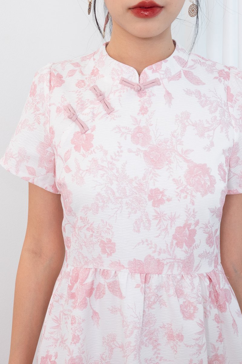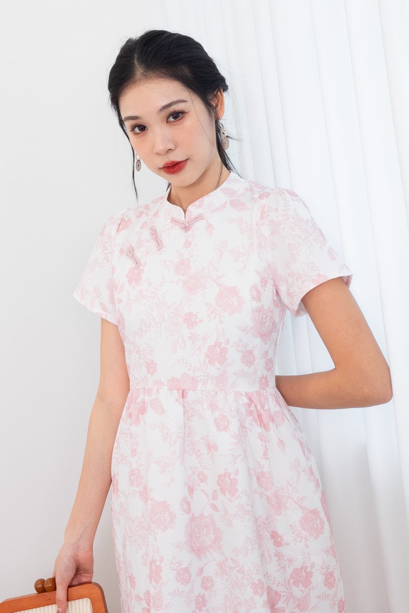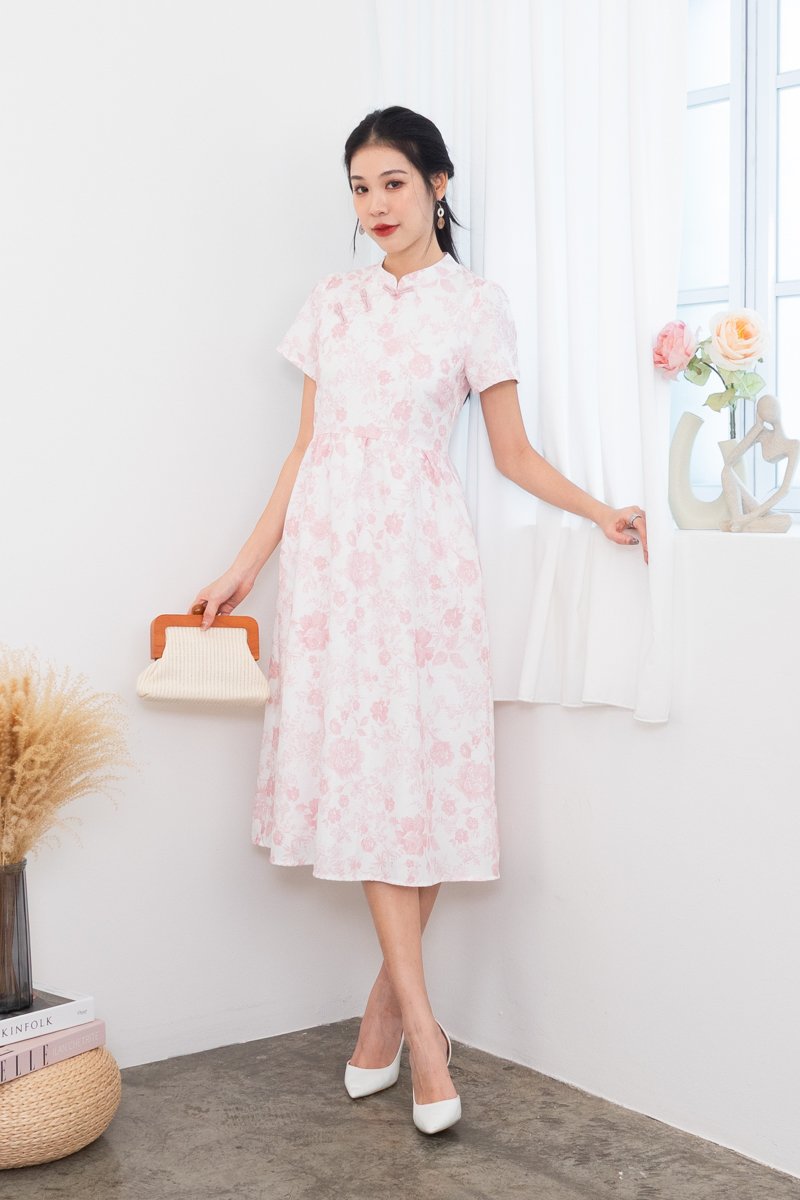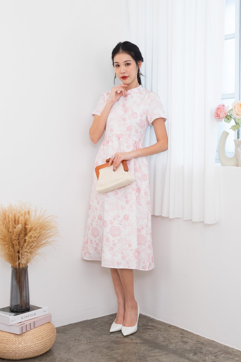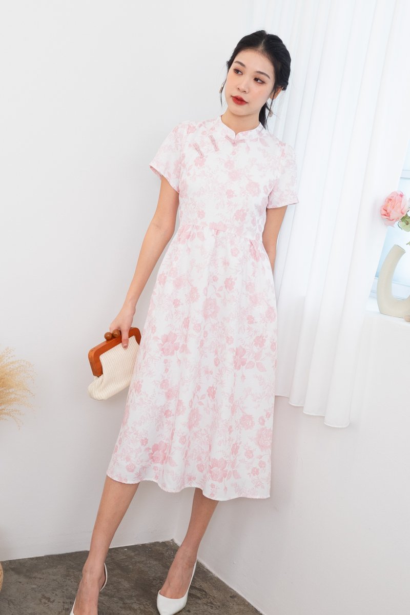 Yu Huan (玉环) Porcelain Sleeved Cheongsam Skater Midi Dress in Pink